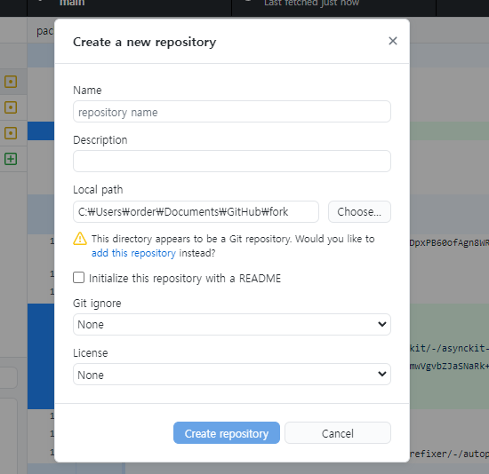 - Local path: 레포지토리가 생성될 경로, 하위 경로에 파일이 있으면 생성되지 않아요. 변경하지 말아주세요.