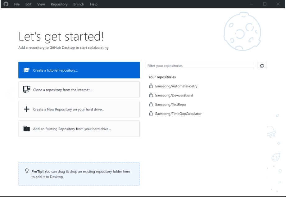이 중에서 가장 접하기 쉽고 사용하기 쉬운 Github Desktop을 설치해봅시다.