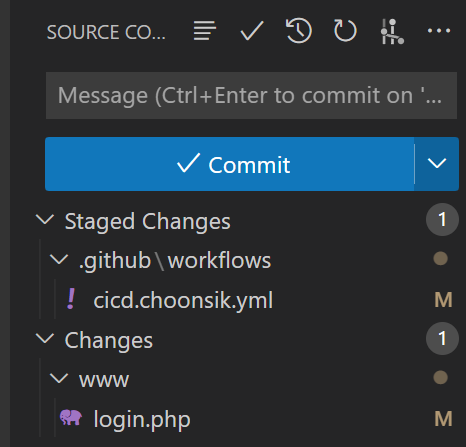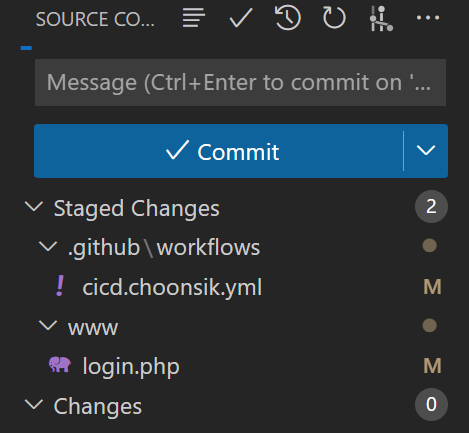 Staged Changes와 Changes 아래에 변경 사항이 각 폴더 구조로 나와 있는 것을 확인할 수 있습니다. Changes는 그냥 파일 내용을 변경하면 뜹니다.