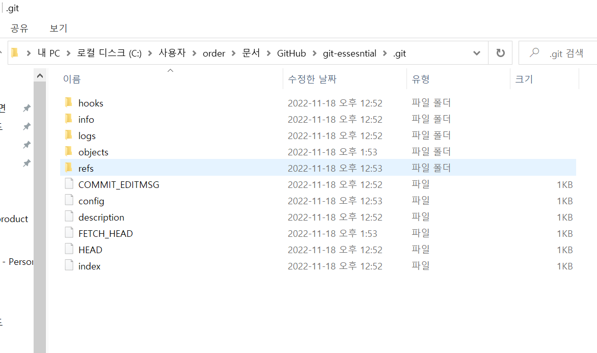 레포지토리를 생성하면 하위 폴더에 .git 폴더가 생성되는 것을 볼 수 있습니다. .git폴더의 내용물을 통해서 레포지토리에 대한 많은 설정을 할 수 있습니다. 예를 들면 코드를 올리기 전(푸시하기 전)에 코드 포멧팅 체크, 테스팅 진행 등의 훅 설정과 같은 것을 할 수 있습니다.