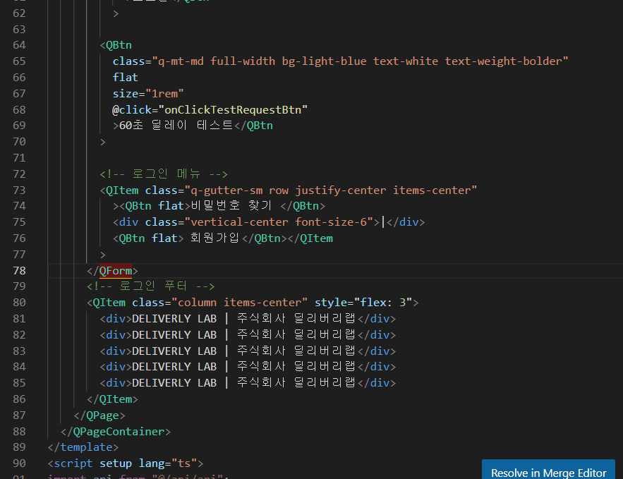 merge 명령어를 통해서 각 부분을 병합하는 것은 실수를 야기할 가능성이 매우 크므로 다루지 않겠습니다! merge는 꼭 IDE나 다른 툴을 통해서 하는 것을 추천 드립니다. 위 상황에서 Accept Current Change를 누르면 아래와 같이 병합이 됩니다.
